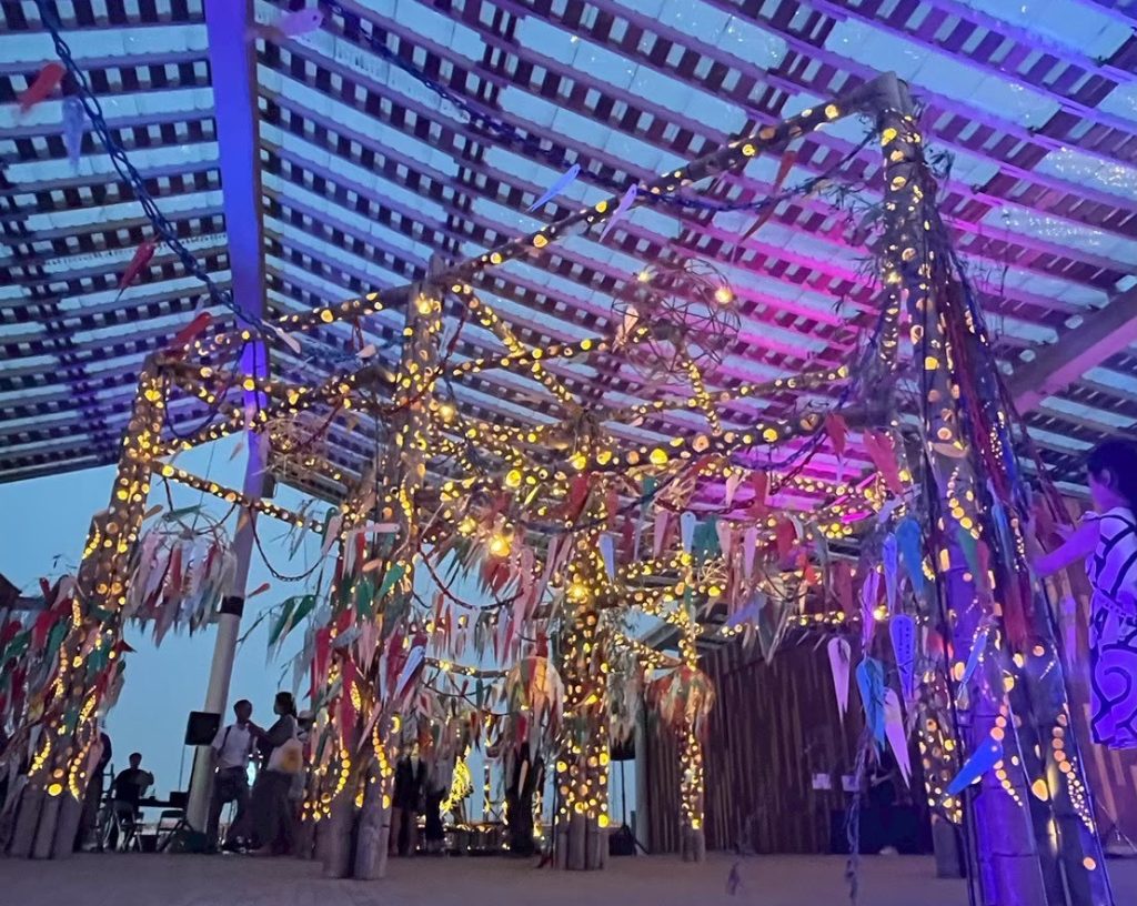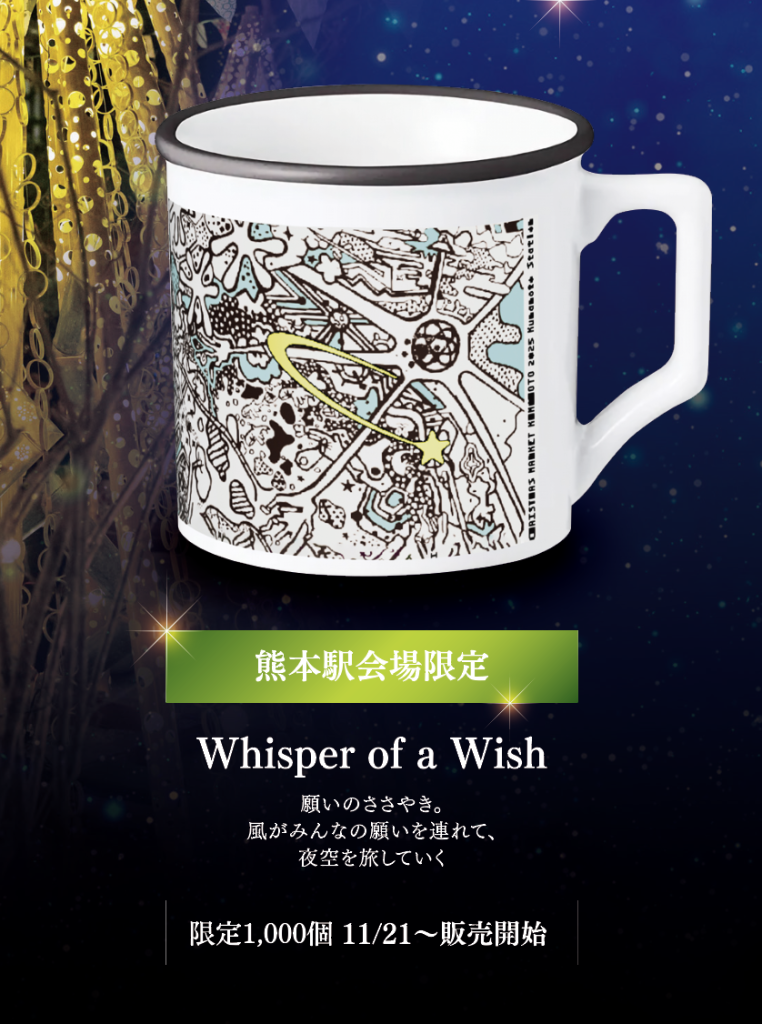 大阪・関西万博の七夕の夜、ALEさんとともに夜空に竹あかりを灯しました。「人工流れ星の開発を進め、人々の願いを自分たちの力で空へ流す」そんなALEさんの美しい挑戦に深く感銘を受けました。その想いを胸に、「優しいクリスマス村を訪れる皆さんの願いが叶いますように」と願いを込め、流れ星にインスパイアを受けたマグカップを熊本のグラフィックデザイナー・イスケさんとデザインしました。この作品が、クリスマス村に集う人々の日常の想いをそっと包んでくれますように!